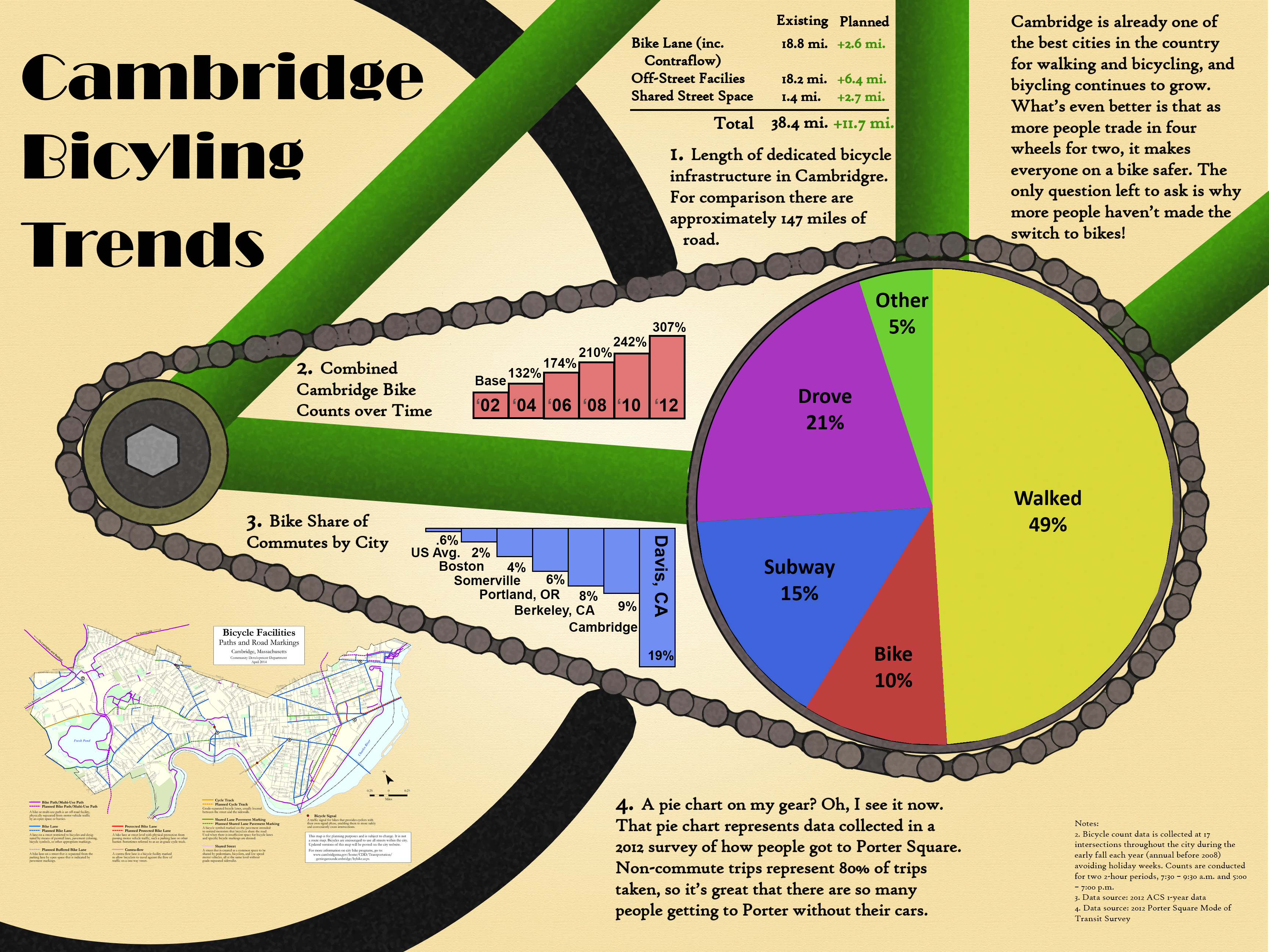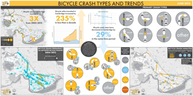 The following infographics were presented as posters on June 12, 2014 at the Open House for the Cambridge Bicycle Network Plan. All infographics were created by Toole Design Group, with the exception of the "Cambridge Bicycling Trends" poster, which was produced by the City of Cambridge. Click the images to view the full size versions of each poster.
