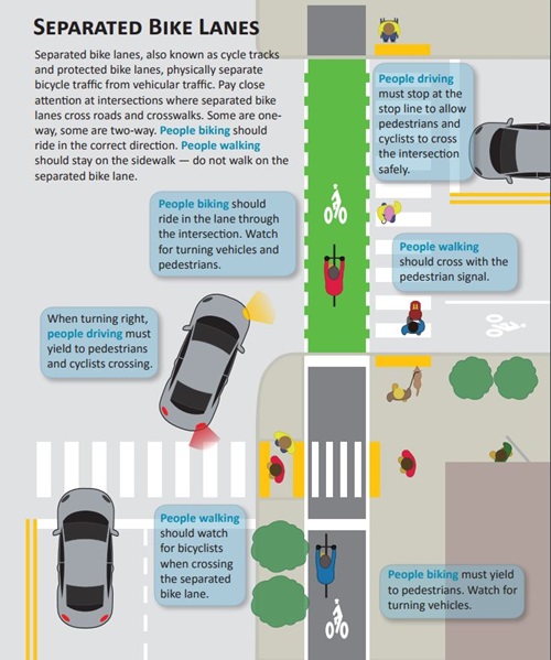 - Separated bike lanes afford the same access as regular bike lanes. As always, pay special attention at driveways and intersections for turning cars.