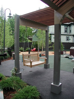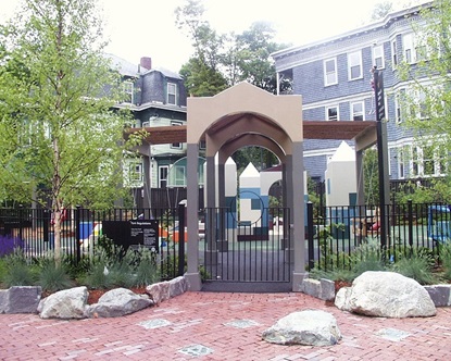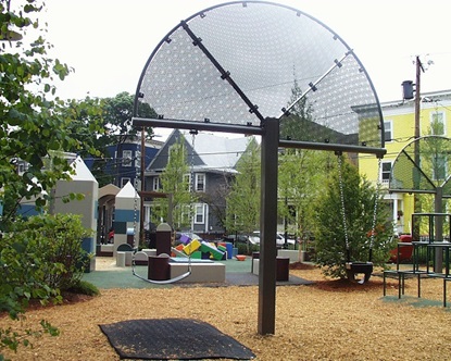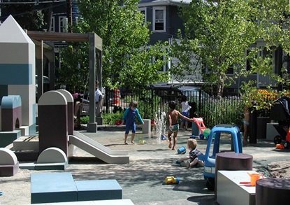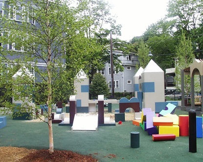 Maple Avenue Park is located at the intersection of Maple Avenue and Marie Avenue in the Mid Cambridge neighborhood and was completely renovated in 2004. The play area features the concept of 'oversized building blocks'. The centerpiece of the new park is a 'Castle' constructed of 'building blocks' surrounding a sand and water play area. Benches and tables, designed to look like building blocks, carry the theme throughout the park. The blocks and tables are all made of a plastic material called Corian, and the corners of the blocks are rounded to reduce the risk of small children being injured. Other play equipment has been placed around this 'Castle', while care has been given to maintain enough open space to allow children to circulate freely throughout the park.