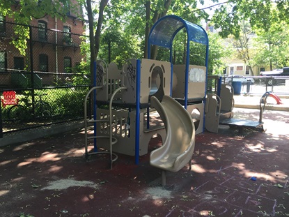 - Enclosed Tot Lot and Entrance Gates: Commitment to include a 20 x 40 ft. enclosed flat toddler play area to accommodate younger children that includes seating, a sand play area and an additional infant and toddler play structure that includes a slide, cleated toddler incline, toddler stairs, steering wheel, mirrored panel, and deck with covering. Additional commitment to add gates upon entry to the field at both park entrances.