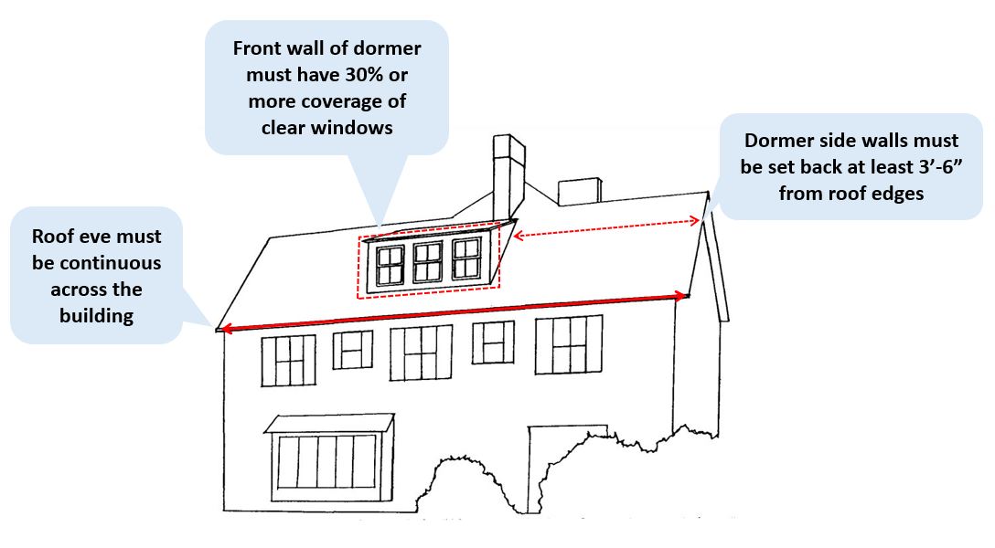 Because the zoning rules for all residential buildings were simplified in 2025, many dormer additions could meet the current zoning district limitations. But if they don’t, a dormer could be added without needing Board of Zoning Appeal approval if it meets the following requirements: