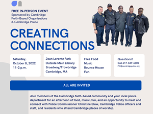 Commissioner Christine Elow and the Cambridge Police Department want to invite the community to two events scheduled next week: Coffee with a Cop Day and Creating Connections, a community fair with Cambridge’s faith-based organizations.