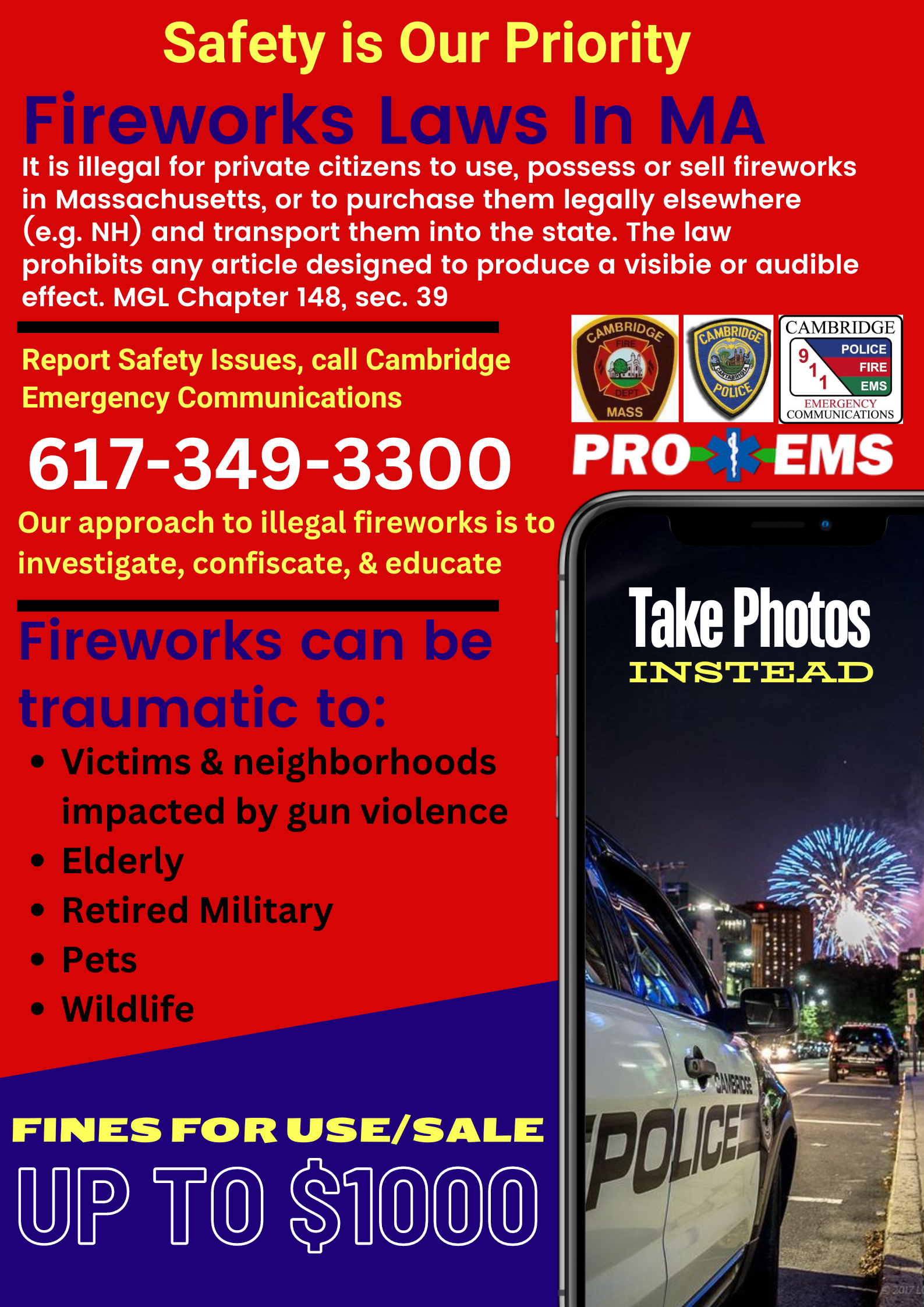 Our Public Safety agencies will have ample staff on duty during the holiday. If you have any information on fireworks or wish to report a safety issue, please call Cambridge Emergency Communications at 617-349-3300.