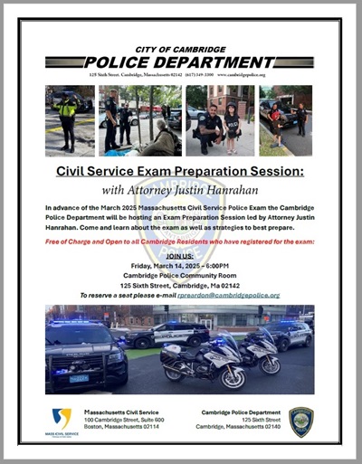 For those who are planning to take the Civil Service Police Exam in March or in the future, CPD will also be hosting a Free Exam Prep Session on Friday, March 14th led by Attorney Justin Hanrahan.  This event will aim to give test takers a better understanding of how the exam is structured and provide strategies to best prepare in order to help the candidates achieve their full potential. There is no charge to attend this session, however for planning purposes participants are asked to reserve a seat by e-mailing Off. Bob Reardon in the Public Information Office at rpreardon@cambridgepolice.org