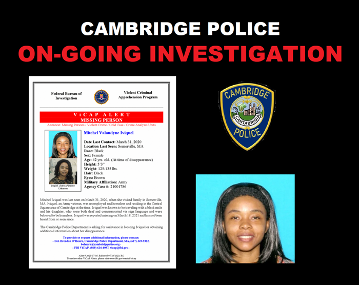 Anyone with information about the current whereabouts of Mitchel Iviquel or with knowledge of what may have happened to her is asked to contact the Cambridge Police Department Criminal Investigations Unit Tip Line at (617) 349-3121.