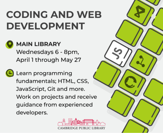 Would-be programmers with basic computer literacy are invited to join this workshop series. Over eight weeks, participants will learn programming fundamentals, build web pages with HTML, CSS, and JavaScript, use developer tools such as Git, and more. There will be time to work on projects and receive guidance from experienced developers, with optional homework materials made available for more in-depth learning. While you can join at any time, starting at the beginning of the course is encouraged for the best experience. Registration is required.