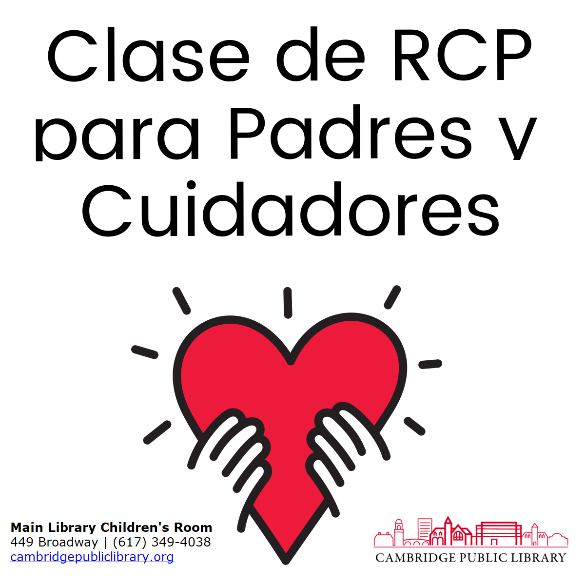 Esta clase de RCP cubrirá habilidades para salvar la vida de bebés, niños y adultos. Utilizaremos tecnología y práctica para que los estudiantes adquieran habilidades y confianza para ayudar a salvar la vida en una situación médica. Esta clase también cubrirá entrenamiento y el uso de DEA (Desfibrilador Externo Automatizado) para todas las edades, junto con habilidades para salvar la vida de una persona en situación de asfixia. Los estudiantes recibirán su certificado al completar la clase. Tenga en cuenta que la Ciudad no es responsable del contenido o equipo de entrenamiento.