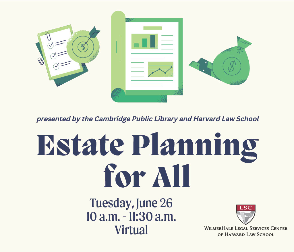 The Cambridge Public Library and Legal Services Center of Harvard Law School are excited to offer Estate Planning for All. Estate plans can help you prepare for unexpected changes, offer a sense of security in uncertain times, and ensure that your wishes will be carried out if you become ill, incapacitated, or die unexpectedly. Everyone—regardless of background or financial situation—can have an estate plan.