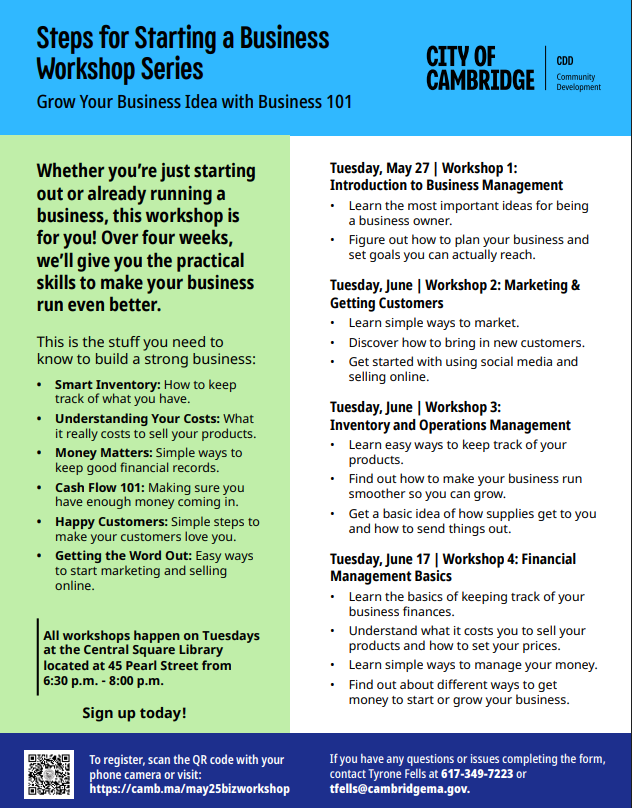 Are you an aspiring entrepreneur or small business owner looking to start a business in the City of Cambridge. This workshop is a comprehensive, four-week program tailored specifically for early-stage entrepreneurs and established business owners seeking to enhance their business operations. The curriculum addresses key aspects of business operations. This series of workshops will establish a solid foundation in essential principles of entrepreneurship and business ownership.