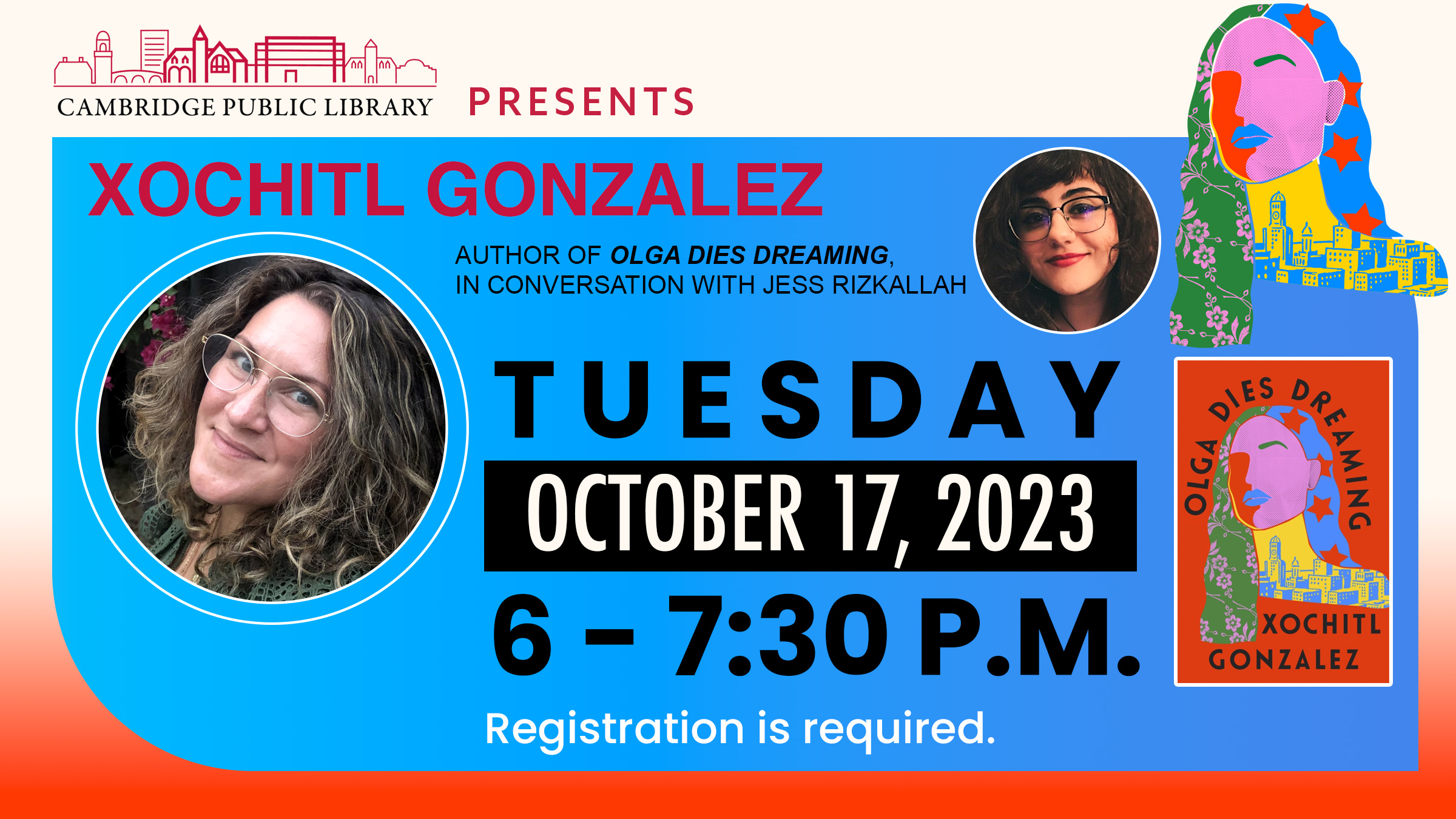 CAMBRIDGE, MA, September 28- The Main Library will welcome Xochitl Gonzalez for a reading and signing of her New York Times bestseller, Olga Dies Dreaming, on Tuesday, October 17, from 6-7:30 p.m. Gonzalez will be in conversation with local poet and artist Jess Rizkallah, author of the magic my body becomes. Attendees can join in-person or online. Registration is required.