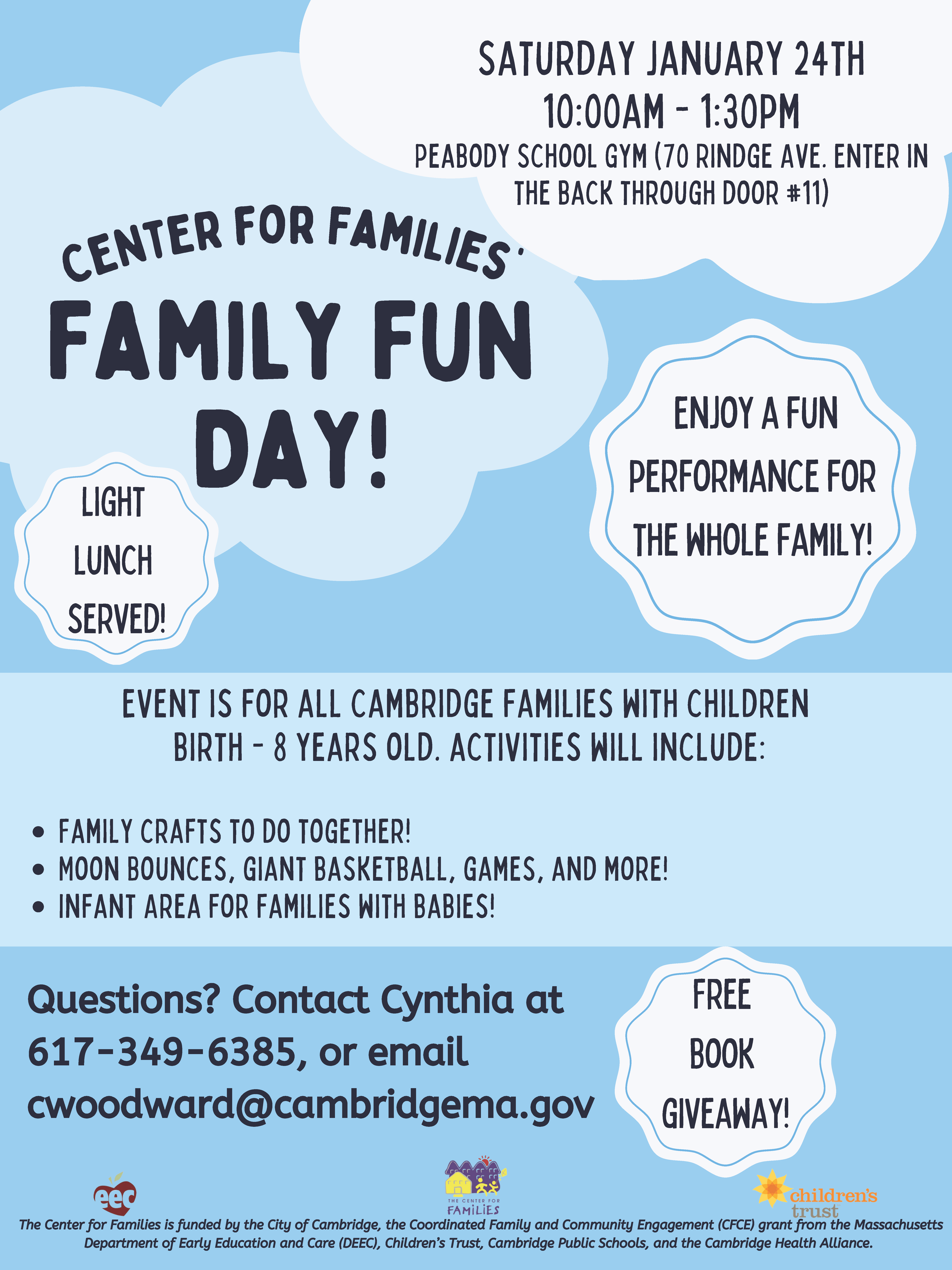 Join the Center for Families for Winter Family Fun Day! This free event, open to Cambridge families with children ages 8 and younger, is on Saturday, January 24 from 10 a.m. – 1:30 p.m. at Peabody School Gym (70 Rindge Ave. Enter in the back through Door #11.)