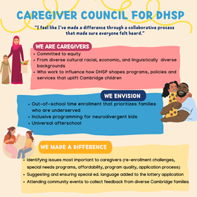 The Caregiver Council for DHSP is a group of caregivers who work together to increase equitable access to the Department of Human Service Programs' afterschool and Out-of-School Time (OST) programs. The Caregiver Council for DHSP represents diverse caregiver perspectives and informs DHSP's processes, programs, and outreach strategies related to afterschool and OST.
