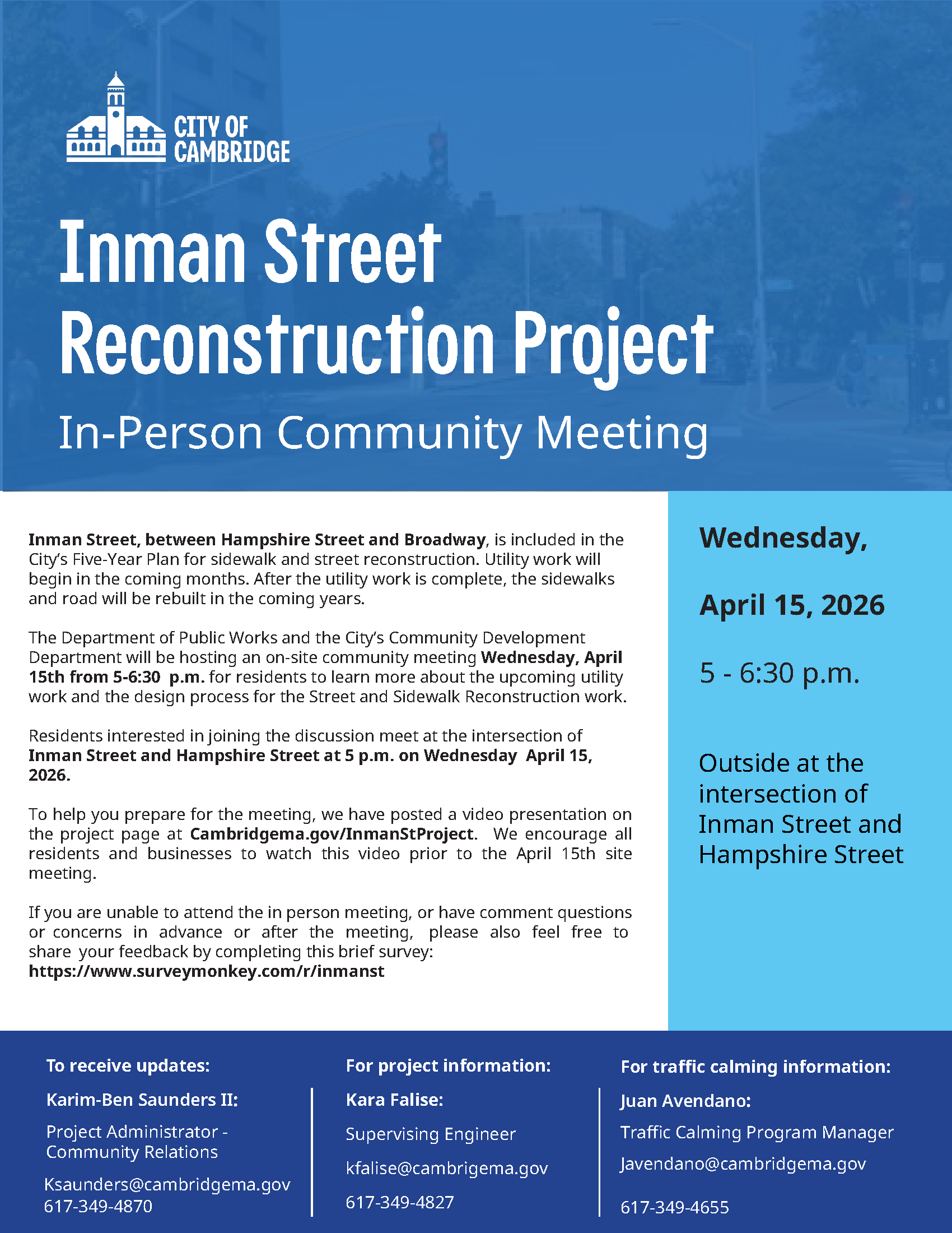 Residents interested in joining the discussion meet at the intersection of Inman Street and Hampshire Street at 5 p.m. on Wednesday April 15, 2026. To help you prepare for the meeting, we have posted a video presentation on the project page at Cambridgema.gov/InmanStProject. We encourage all residents and businesses to watch this video prior to the April 15th site meeting.