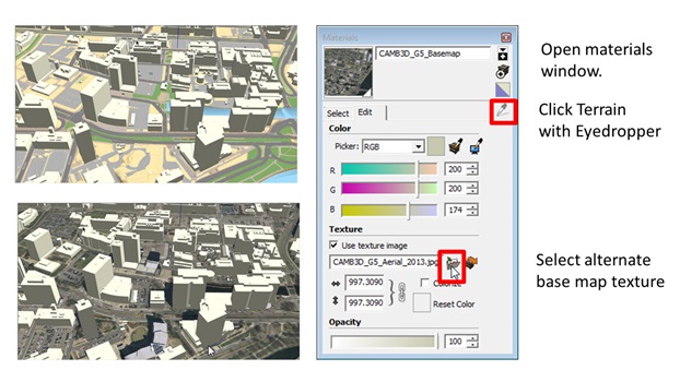 These images have extents that align precisely with the tile boundary included with all of the other data Camb3D files for easy registration. In SketchUp, ground plan images may be easily applied the terrain. From the Materials Window, use the eye dropper to select the terrain material, then choose the desired ground plan image in the Edit tab.