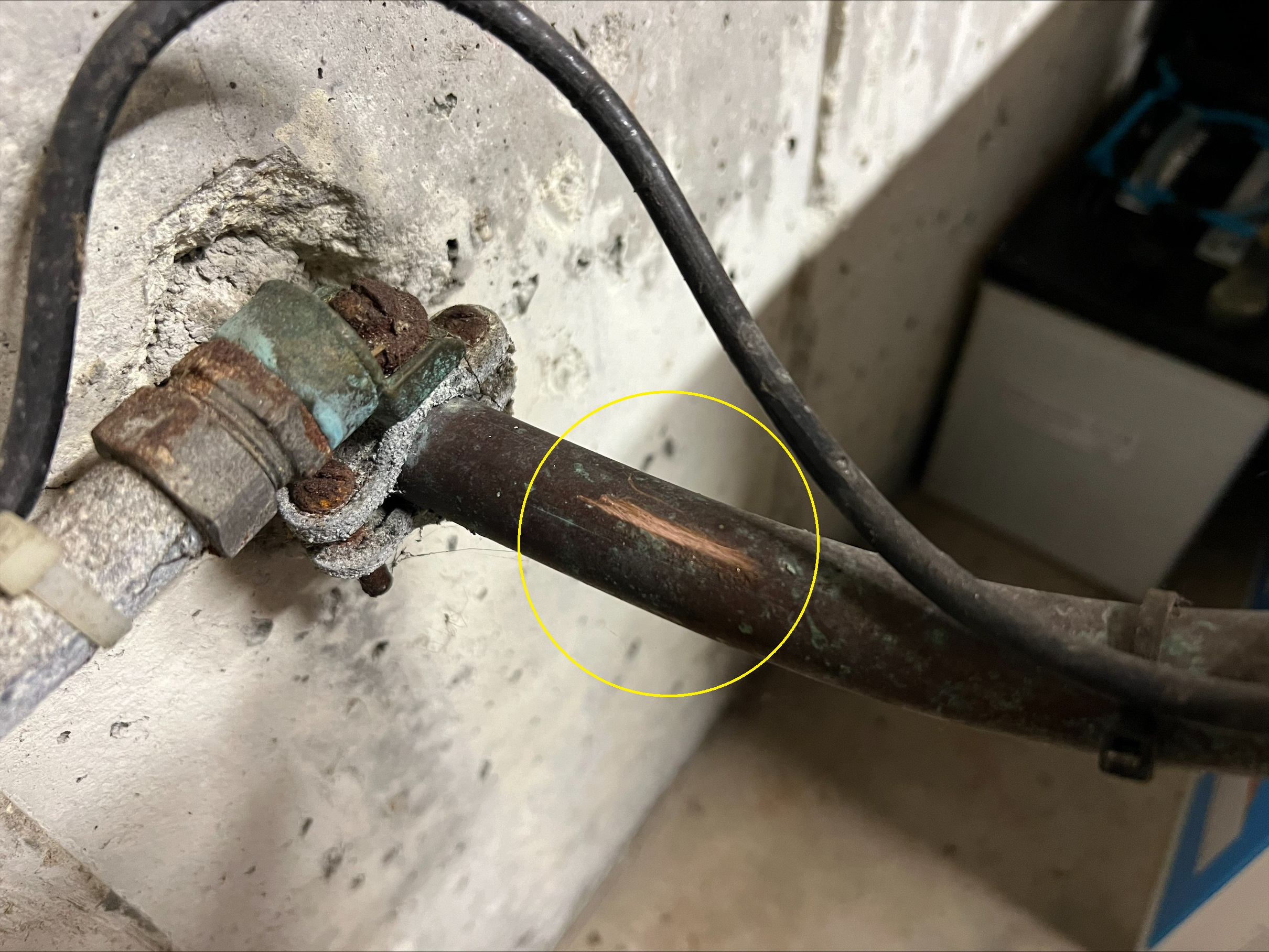 Locate your service pipe near the meter. The section where it comes through the wall is the most important part. See the circled area in photo below.