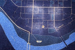 Drawn Water combines real drinking water, symbolic elements, and a 2500 sq. foot map that focuses attention on the importance of water in our lives. The underground pipes that bring the water throughout the city are marked on the map, along with water fountains, swimming pools, and ponds. Actual water pipes form functional seats and suggest the sizes of pipes in the map. A transparent water column is placed on the map at the site of the city's holding reservoir, Payson Park. The art continues outside the building. A shallow depression on both sides of a path reveals a 42 inch pipe, reminding us of the connection between the treatment facility and Fresh Pond, the city's reservoir. A circular opening in the fence around the pond focuses views of the water intake. A drinking fountain in the form of a squirting arc offers water to users of the path. When they drink from the fountain, the water column reacts with light, bubbles and changes in the water level, as if the water had been drawn through the large pipe back from the treatment facility. There are also thirteen bronze utility covers located throughout the city, each with a different water-related image. The locations of the covers are marked on the floor map to encourage a treasure hunt in the neighborhoods. Mags Harries and Lajos Héder have collaborated on several projects since 1990, ranging from large-scale commissions to temporary installations and performances.