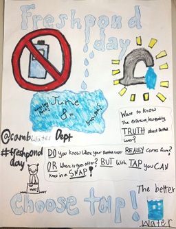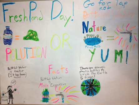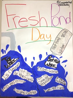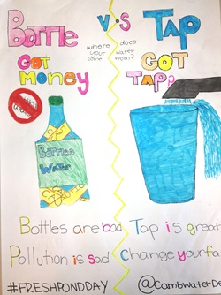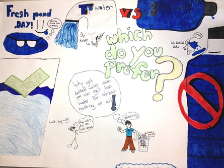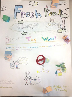 Posters made by students in the Upper Elementary class at the Cambridge Montessori School highlighting the benefits of choosing tap water over bottled.