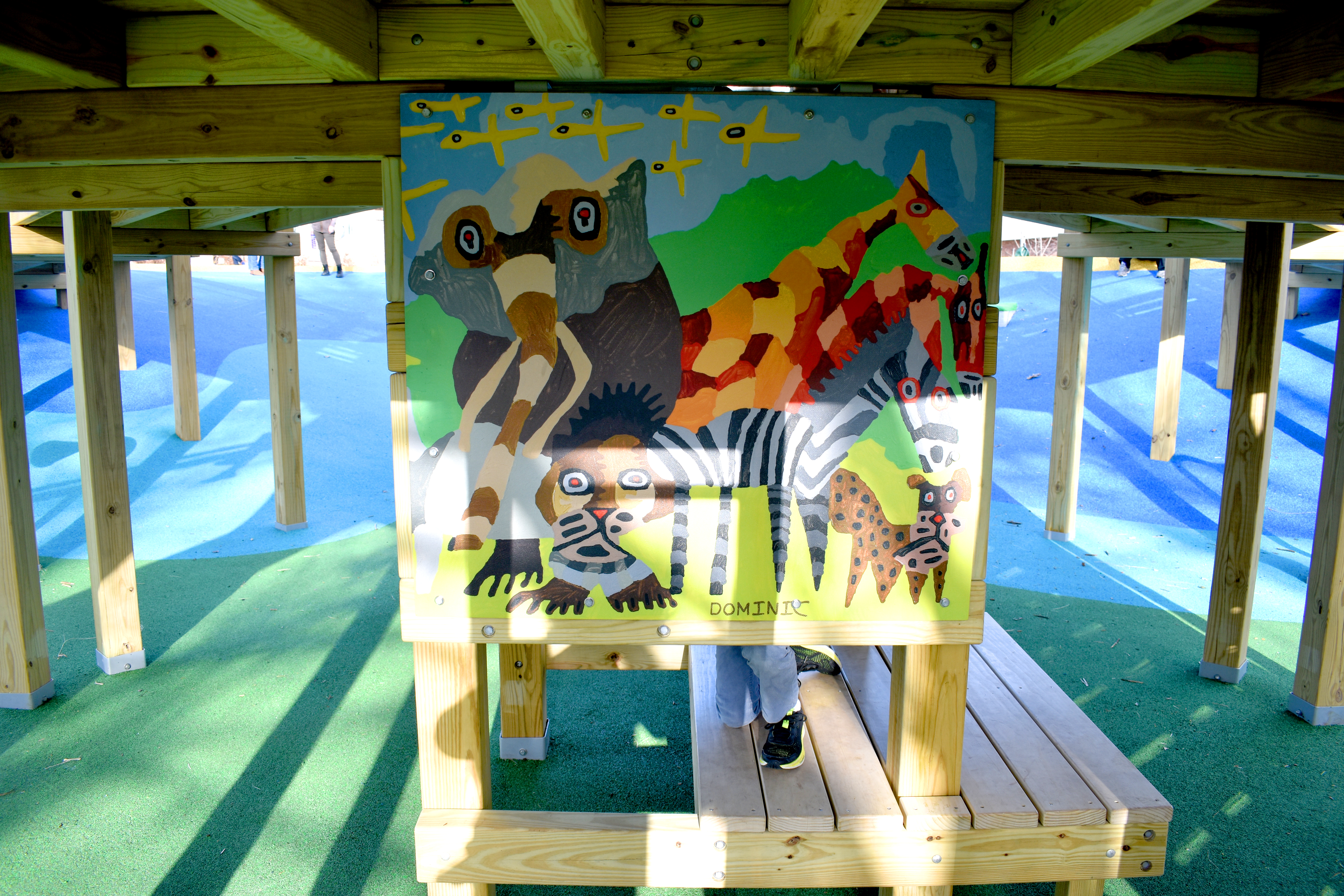Climbing one of the play structures or otherwise exploring the Louis A. DePasquale Universal Design Playground at Danehy Park, you’ll spot pictures by Dominic Killiany, a prolific 24-year-old artist living with autism. Panels throughout the park reproduce his brightly colored paintings of Boston’s Zakim Bridge, street signs, fish, a lion, zebra, elephant and giraffes.