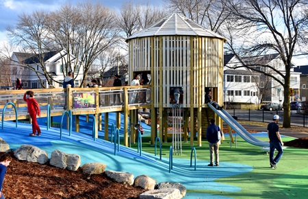 All are invited to attend a Dedication Ceremony for the playground at 75 Field St. on Saturday, April 30, 2022, at 11 a.m. (rain date: May 1 at 11 a.m.). Refreshments will be served. Admission is free. Located between Field Street and the Briston Arms residential complex, the 30,000 square foot play area is the first developed by the City of Cambridge to fully incorporate Universal Design—a concept that all the playground features should be as welcoming to and as usable as possible by people of all abilities.