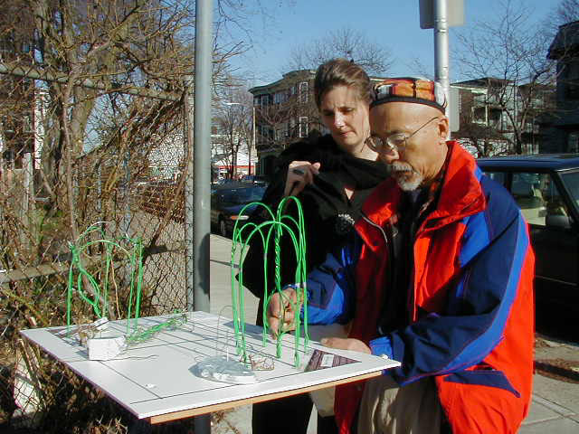 The park is located next to the former Squirrel Nut Brand candy factory in a neighborhood that was known for its candy manufacturing in the nineteenth century. The park became home to community gardens for 25 years, and a climbing rose vine that flourished during that period took on symbolic significance. Uchida sculpted the archway to support (and echo the shape of) the beloved roses, which previously had been rambling over a chain link fence.