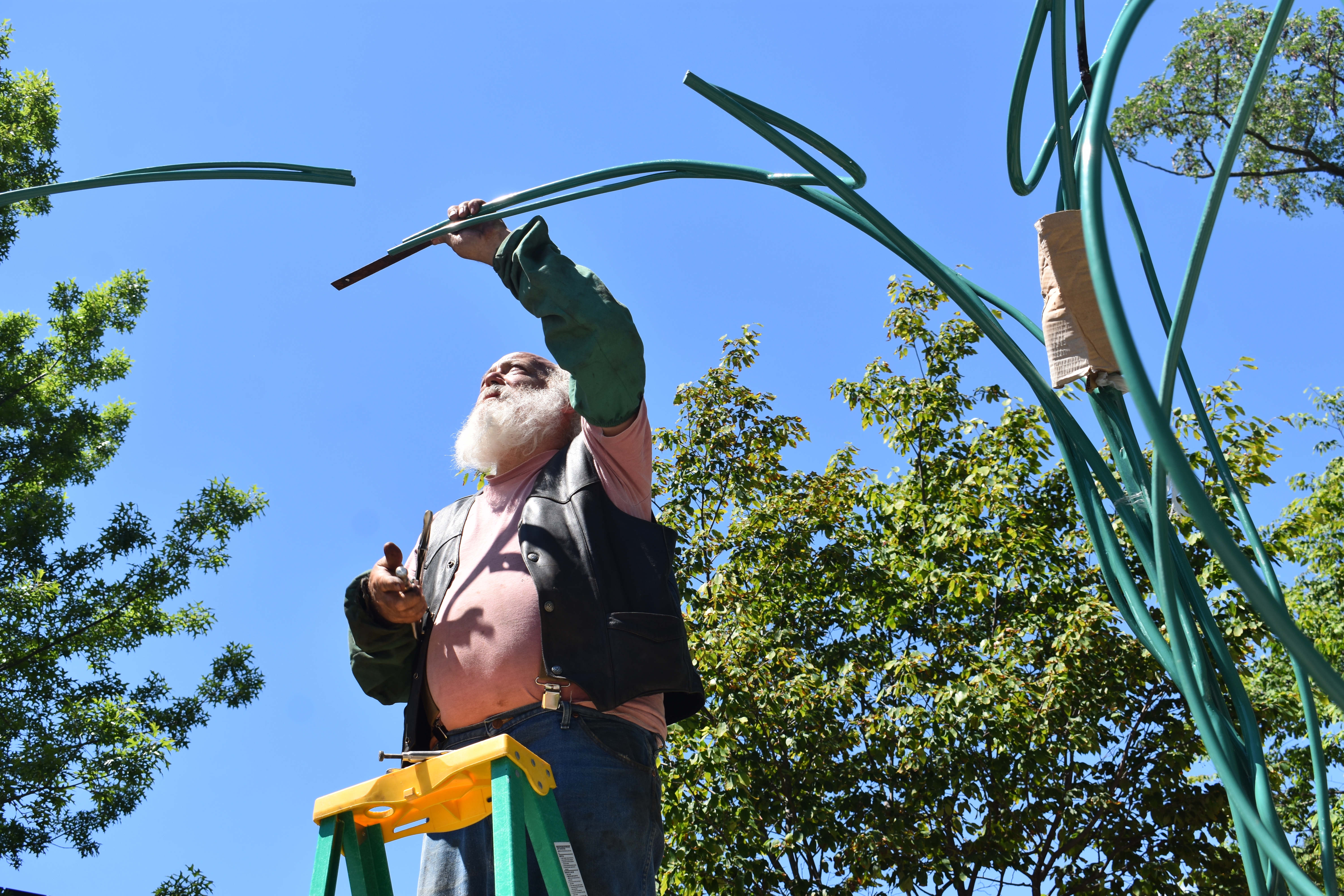 Bart Uchida under his restored "Rose Arbor" at Squirrel Brand Park, Cambridge, June 2021. (Cambridge Arts / Greg Cook)