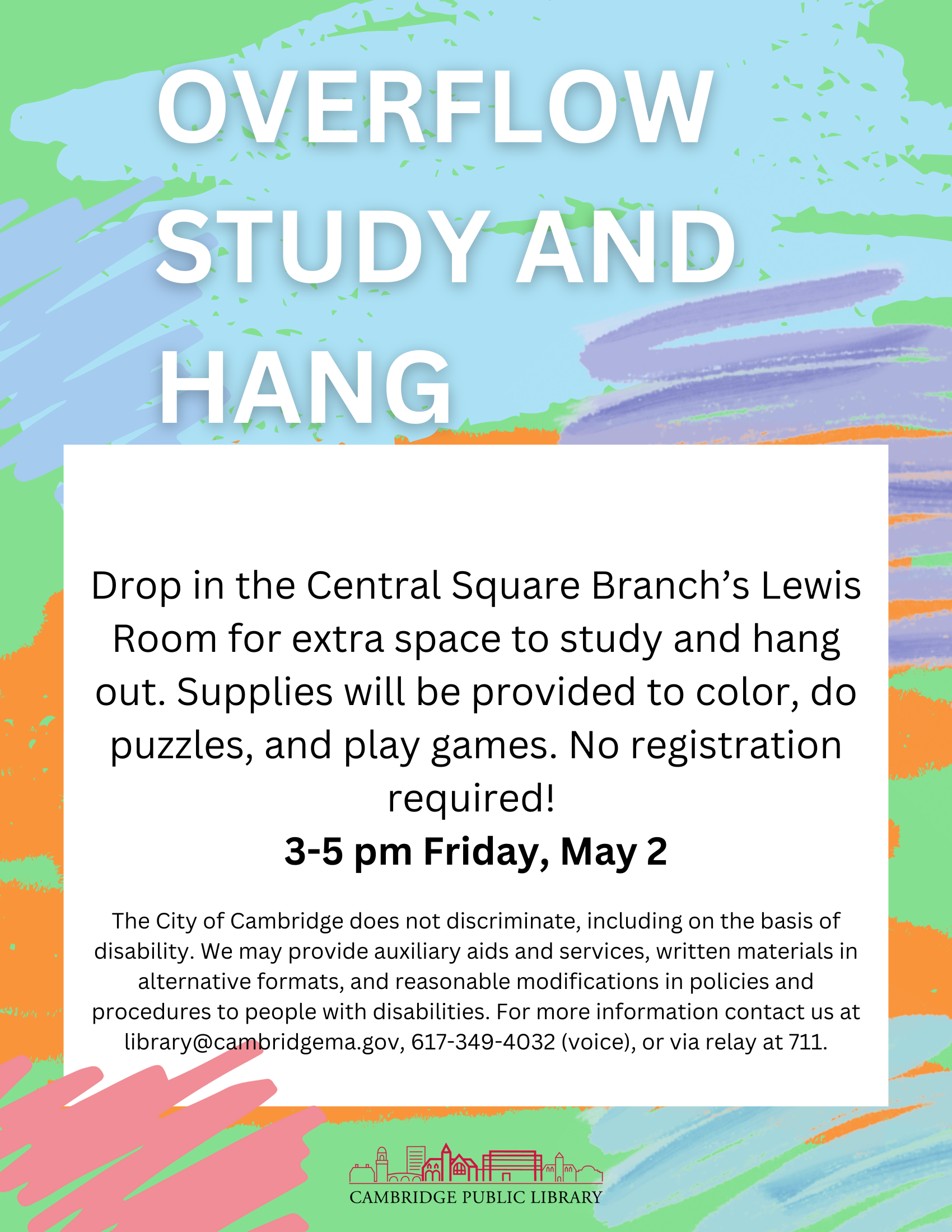 The City of Cambridge does not discriminate, including on the basis of disability. We may provide auxiliary aids and services, written materials in alternative formats, and reasonable modifications in policies and procedures to people with disabilities. For more information contact us at library@cambridgema.gov, 617-349-4032 (voice), or via relay at 711.