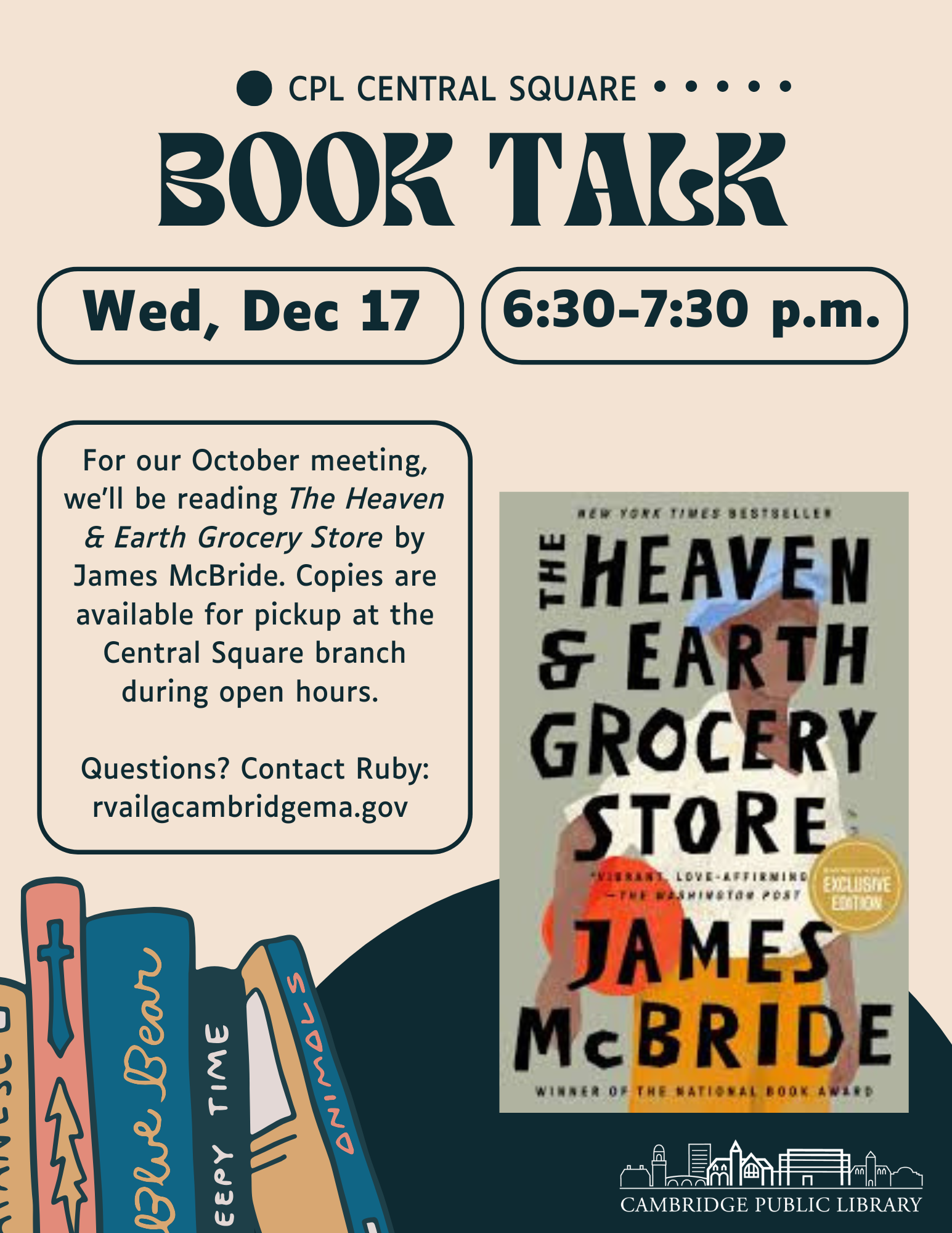 This month, we're reading The Heaven & Earth Grocery Store by James McBride. Copies are available for pickup at the Branch.