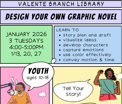 Learn how to visually capture your own memoir or fictional creation in a short graphic novel through story planning, character development, and techniques for capturing emotions, motion, and time. Materials provided and no prior art or author experience needed! Registration is required, and registering for this session includes the following two Tuesdays 1/20, and 1/27. This program is for ages 10-18.