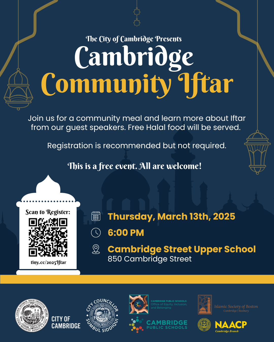 Join us for a community meal and learn more about Iftar from our guest speakers and Cambridge Public School students. Free Halal food will be served.