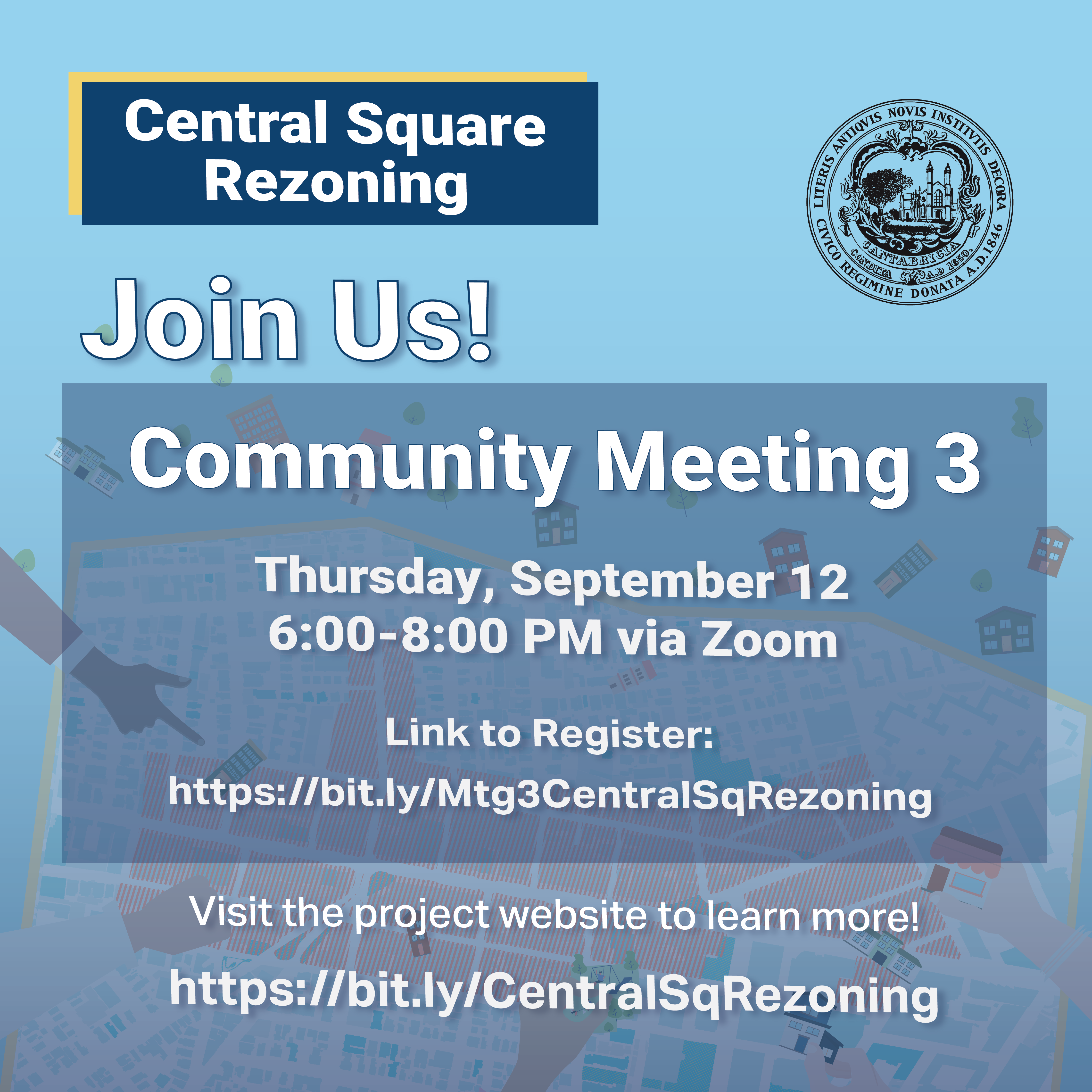 While this is the final community meeting for the project, it is not the end of the community engagement! There will be an in-person event in Central Square in mid-October that will allow the community to come together to learn about the final zoning recommendations alongside other City projects in Central Square.