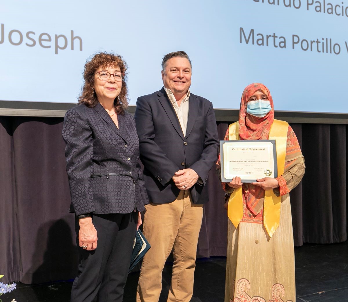 Photo caption: Kamrun (right), Vice Mayor Marc McGovern (center), and CLC Director Maria Kefallinou (left) on stage at the 2025 CLC graduation. Kamrun holds her CLC diploma. Photo credit: Kyle Klein.