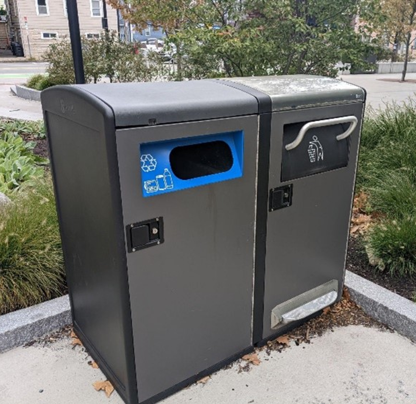 BigBelly trash and recycling compactors in a Cambridge park.