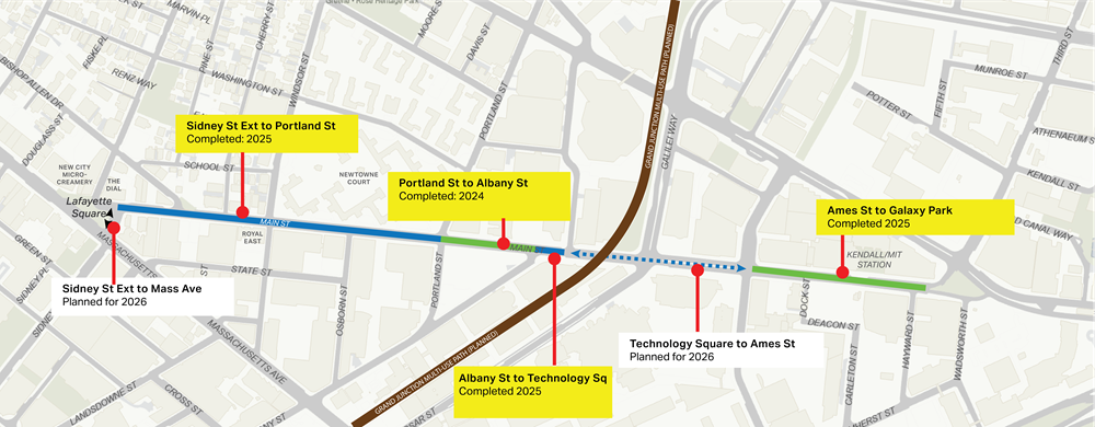 Albany Street to Technology Square: The City of Cambridge will add separated bike lanes between Albany Street and Technology Square as part of a minor maintenance project in the Spring of 2025. Click here to see the plans.